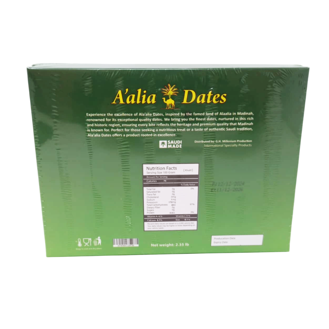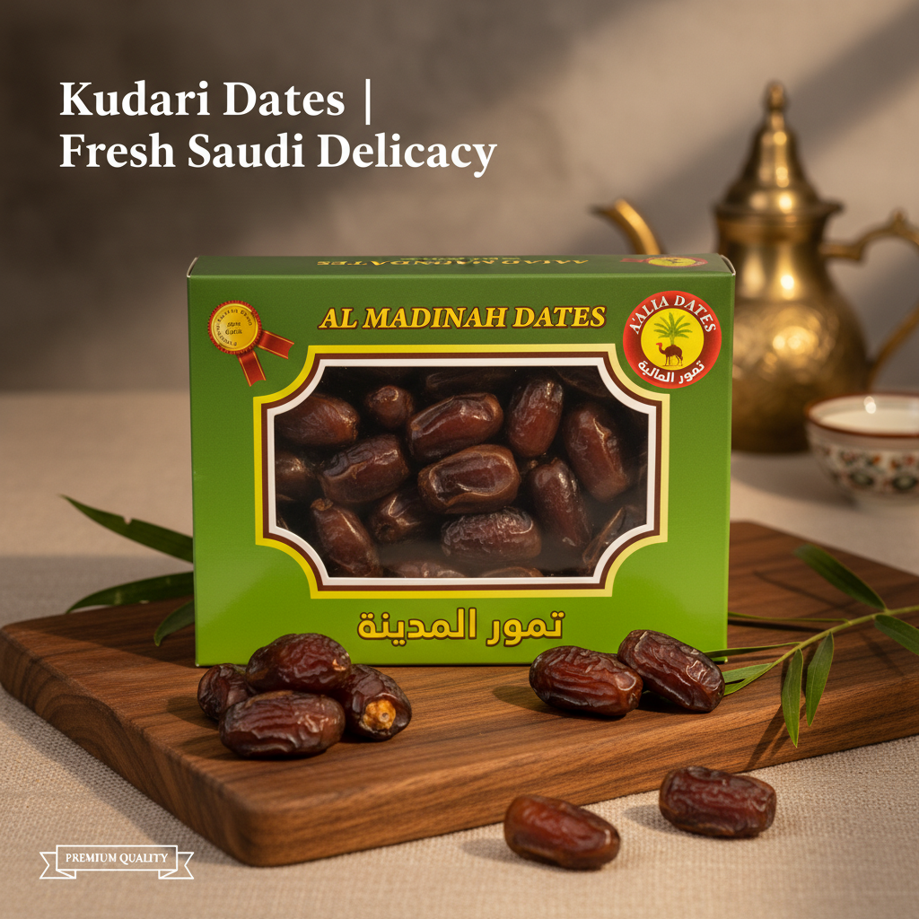 Indulge in the exquisite taste of Al Madinah Kudari Dates, a true gift from the bountiful lands of Saudi Arabia. These premium quality dates are carefully selected from the historic groves of Al Madinah, renowned for producing some of the world's finest dates. Our Kudari dates boast a naturally sweet, rich flavor and a wonderfully soft, succulent texture that melts in your mouth. Packed with essential nutrients, fiber, and natural energy, they make for a perfect healthy snack, a delightful addition to your culinary creations, or a thoughtful gift. Each date is hand-picked and meticulously packaged to preserve its freshness, ensuring you experience the authentic taste and superior quality of Madinah's treasured harvest. Elevate your snacking experience with this gourmet delicacy, ideal for any occasion.