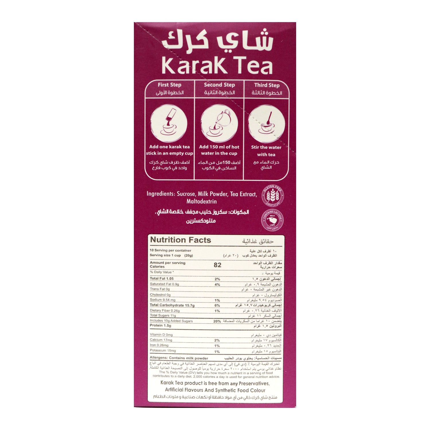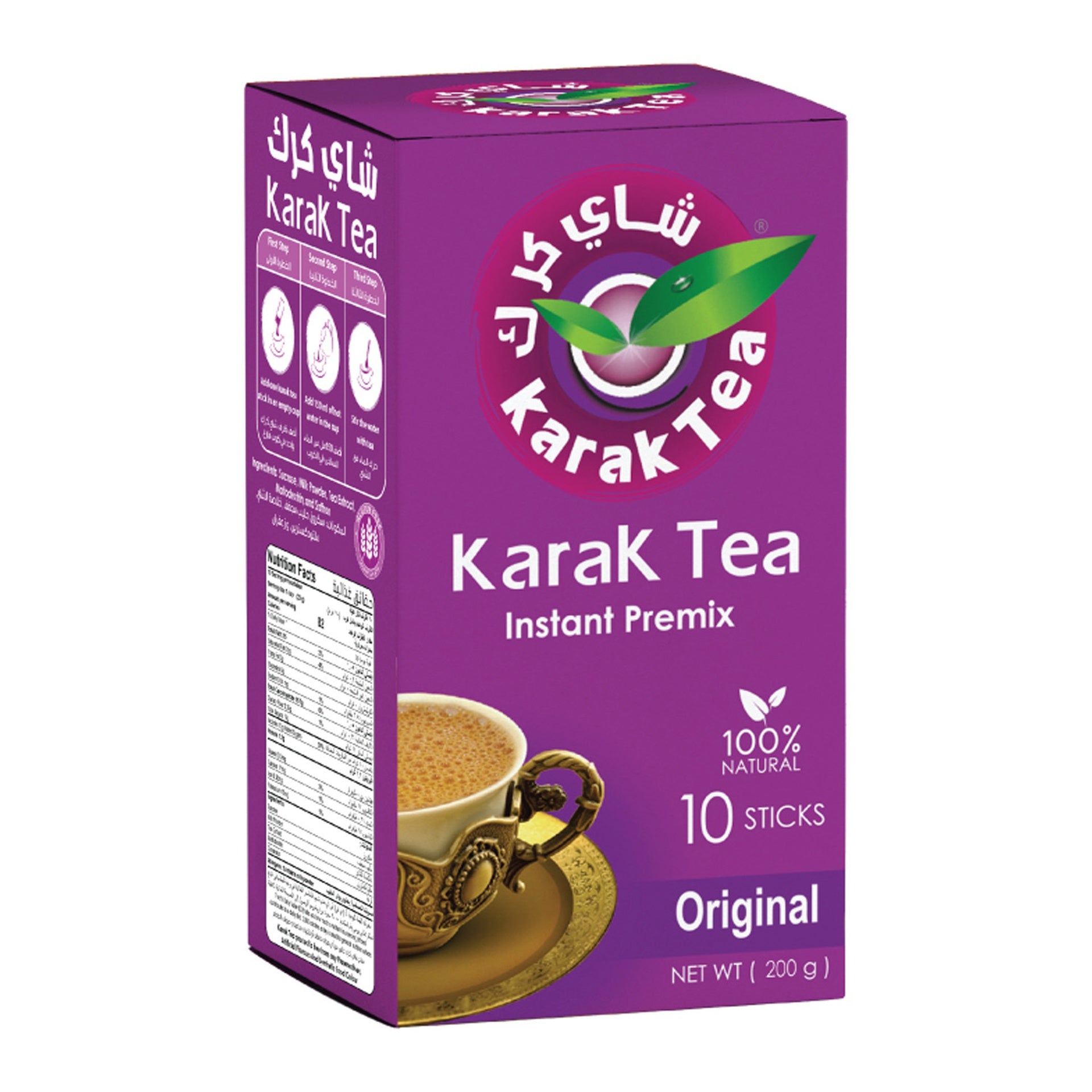 Experience the rich, authentic taste of Karak Tea with our convenient Instant Premix! Perfect for tea lovers on the go, this original blend delivers a robust and comforting cup every time. Made with 100% natural ingredients, our Karak Tea premix ensures a high-quality, delicious beverage without any artificial additives.Each box contains 10 individually portioned sticks, making preparation incredibly simple. Just empty one stick into your favorite mug, add hot water, stir, and your traditional Karak Tea is ready to savor. No need for complicated brewing or multiple ingredients enjoy the perfect balance of tea, milk, and sugar instantly.Whether you're starting your morning, taking a midday break, or unwinding in the evening, Karak Tea Instant Premix offers a quick, easy, and satisfying tea experience. Its compact packaging makes it ideal for home, office, or travel. Indulge in the beloved taste of Karak Tea, crafted for your convenience.