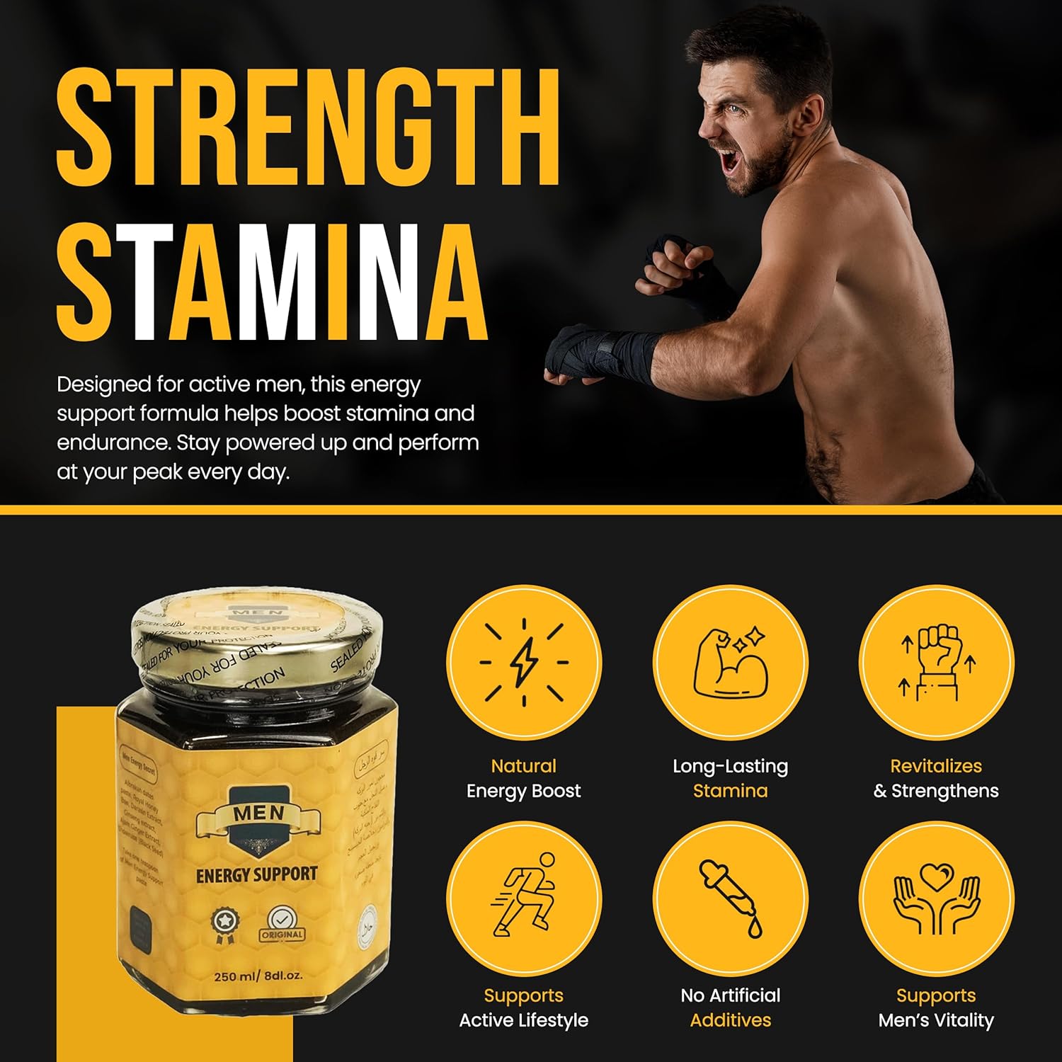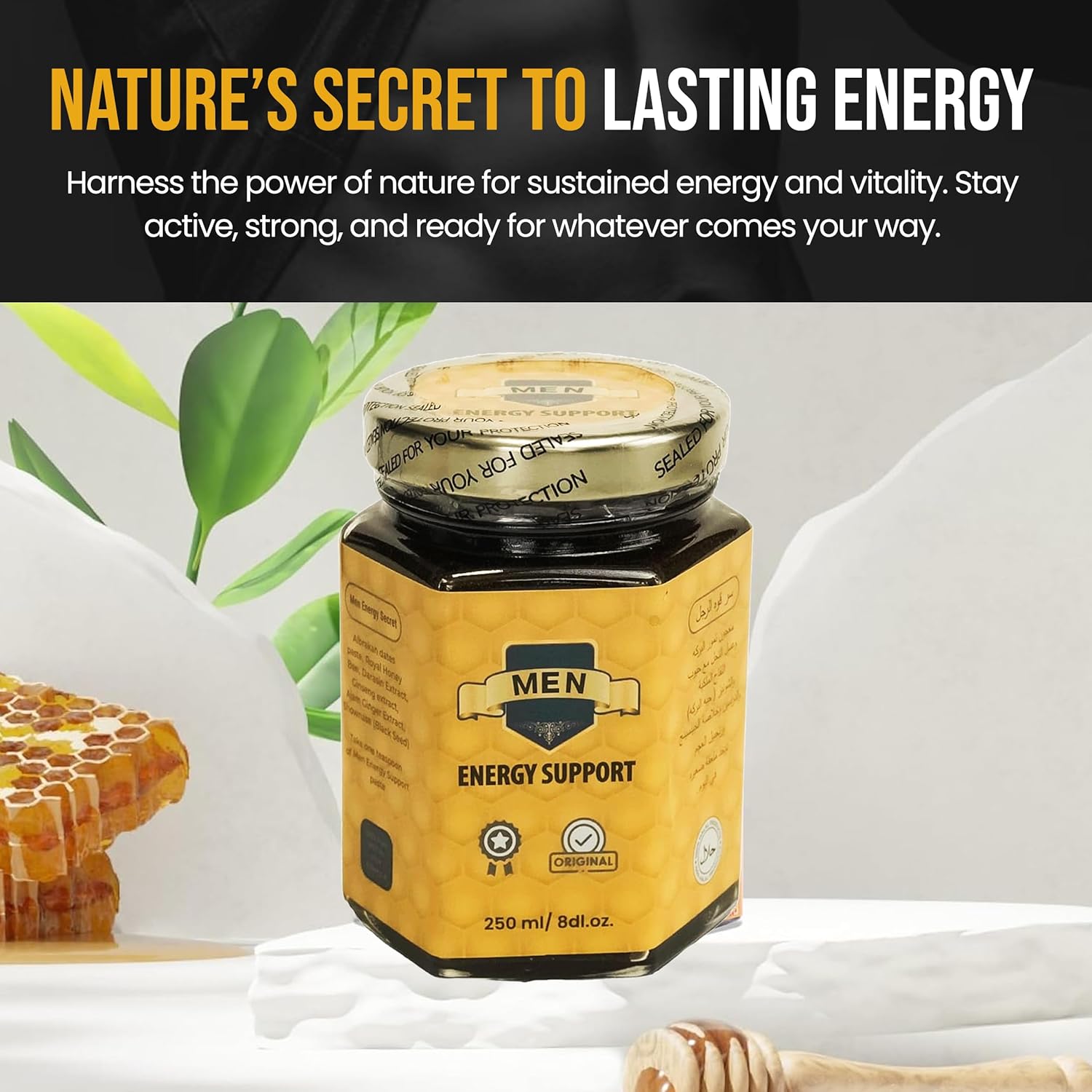 100% natural date paste and pure Sidr honey mixed with royal pollen, black seed, cinnamon, ginseng extract and ginger—nothing artificial.