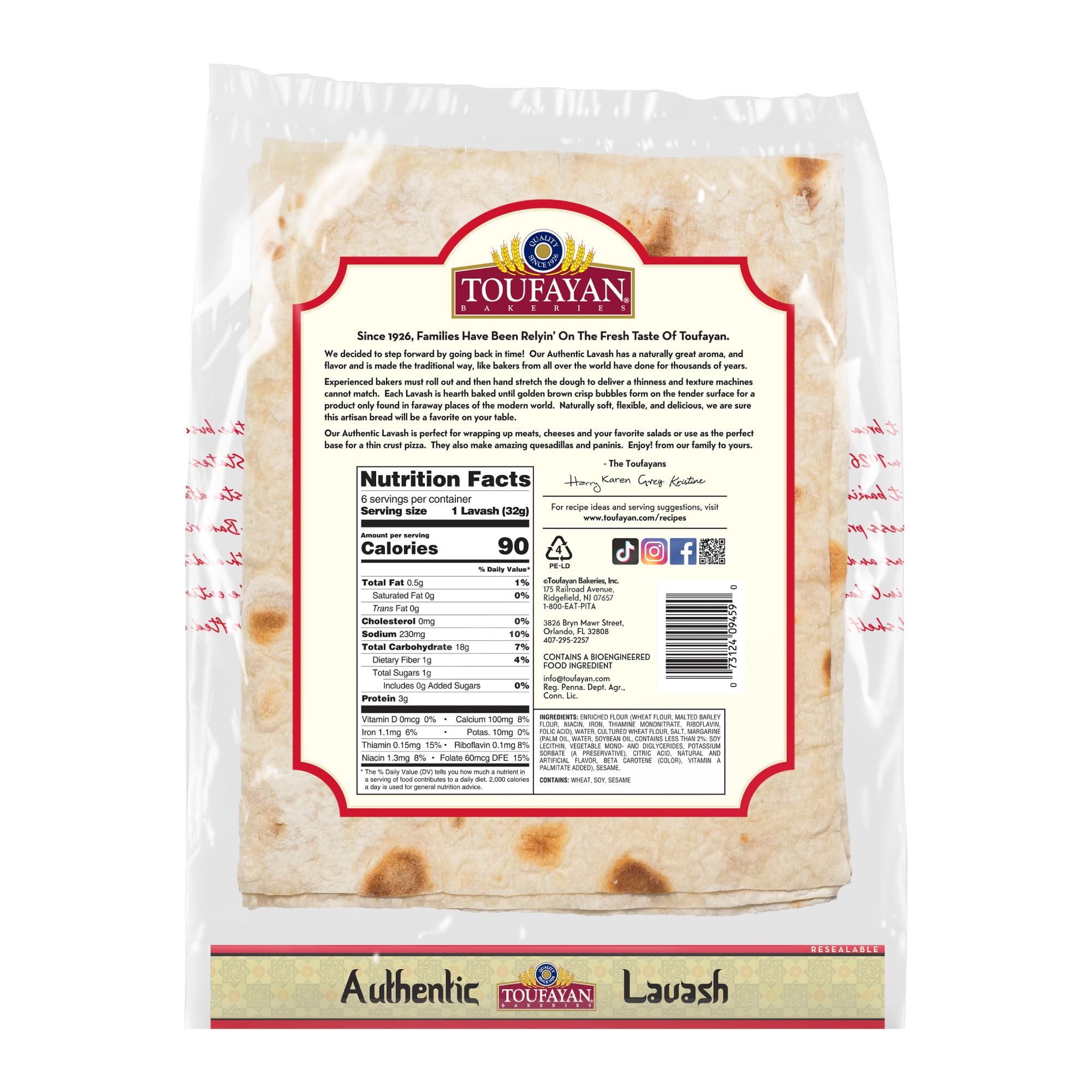 Discover the authentic taste and versatility of Toufayan Classic Lavash Flatbread. Since 1926, Toufayan Bakeries has been crafting delicious breads with time-honored traditions, bringing generations of baking expertise to your table. Our Lavash bread is hand-stretched and oven-baked to achieve a perfectly thin, soft, and flexible texture, making it an ideal choice for a variety of culinary creations.This 6-count pack of 6.77 oz flatbreads is your go-to for quick and easy meals or gourmet appetizers. Use them to create savory wraps filled with your favorite meats and cheeses, or layer them with fresh vegetables for a light and healthy option. They transform effortlessly into a crispy, thin-crust pizza base that's ready for your preferred toppings, or simply cut them into chips for dipping. For a warm and comforting snack, they make amazing quesadillas and paninis.Made with natural ingredients and certified Vegan, Toufayan Lavash offers a wholesome choice for any diet. Each bread is a testament to quality, delivering delicious flavor and a satisfying texture that your whole family will love. The resealable packaging ensures freshness, so you can enjoy the delicious taste of authentic Lavash whenever hunger strikes. Elevate your meals with the tradition and quality of Toufayan.